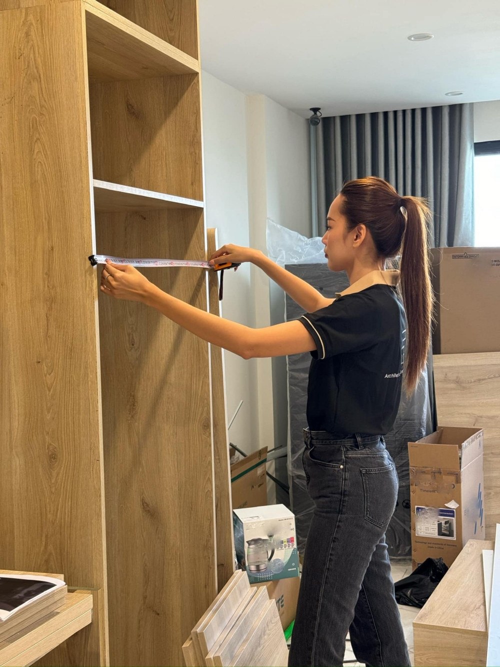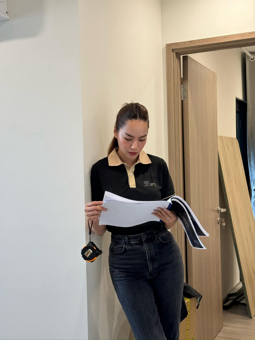 Trong loạt hình ảnh được chia sẻ tại buổi khai trương công ty, Lê Hoàng Phương xuất hiện chỉn chu. Là kiến trúc sư, hoa hậu diện trang phục không quá cầu kỳ để phù hợp tính chất công việc. Nàng hậu chọn những trang phục đơn giản như quần jeans, áo thun đồng phục của công ty và mang giày thể thao để làm việc một cách thuận lợi nhất.