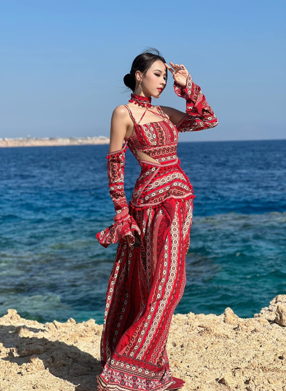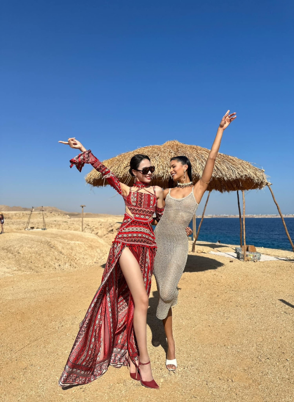 HHTO - Tham gia một bữa tiệc trên bờ biển Ai Cập trong khuôn khổ cuộc thi Miss Intercontinental 2023, Á hậu Ngọc Hằng chọn trang phục mang phong cách bohemien, khoe chân dài miên man.