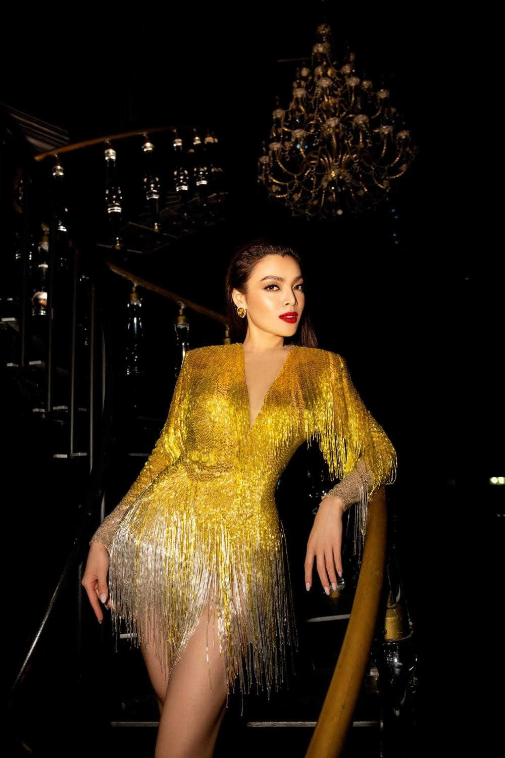 Người đẹp chọn thiết kế tua rua màu vàng ánh kim cực kỳ bắt mắt, cut-out phía sau lưng quyến rũ, đẹp như nữ hoàng của đêm tiệc.