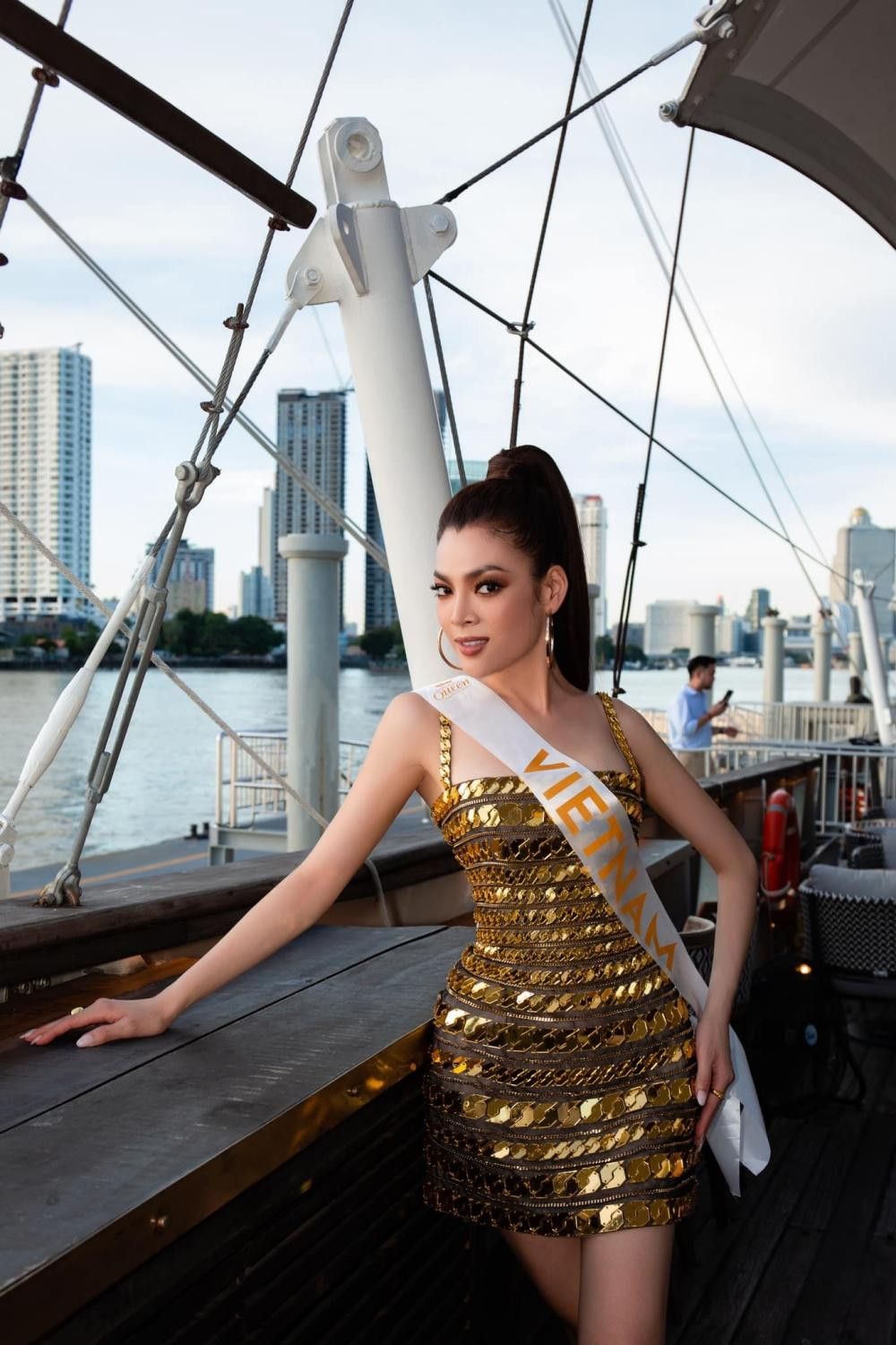 Tham gia tiệc nhẹ nhàng cùng các thí sinh trên du thuyền tại Bangkok cách đây 2 ngày, Trân Đài chọn thiết kế váy ngắn lấp lánh hai dây màu gold cực kỳ bắt mắt.