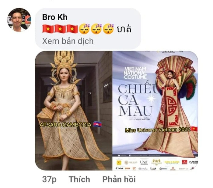Trong khi nhiều khán giả đang khen ngợi trang phục Chiếu Cà Mau nổi bật trên sân khấu, lại có ý nghĩa đặc biệt như chất liệu thân thiện với môi trường thì một cư dân mạng ở Campuchia lại cho rằng thiết kế này đạo nhái trang phục dân tộc mà nước này từng mang đi dự thi ở Miss Universe 2021.