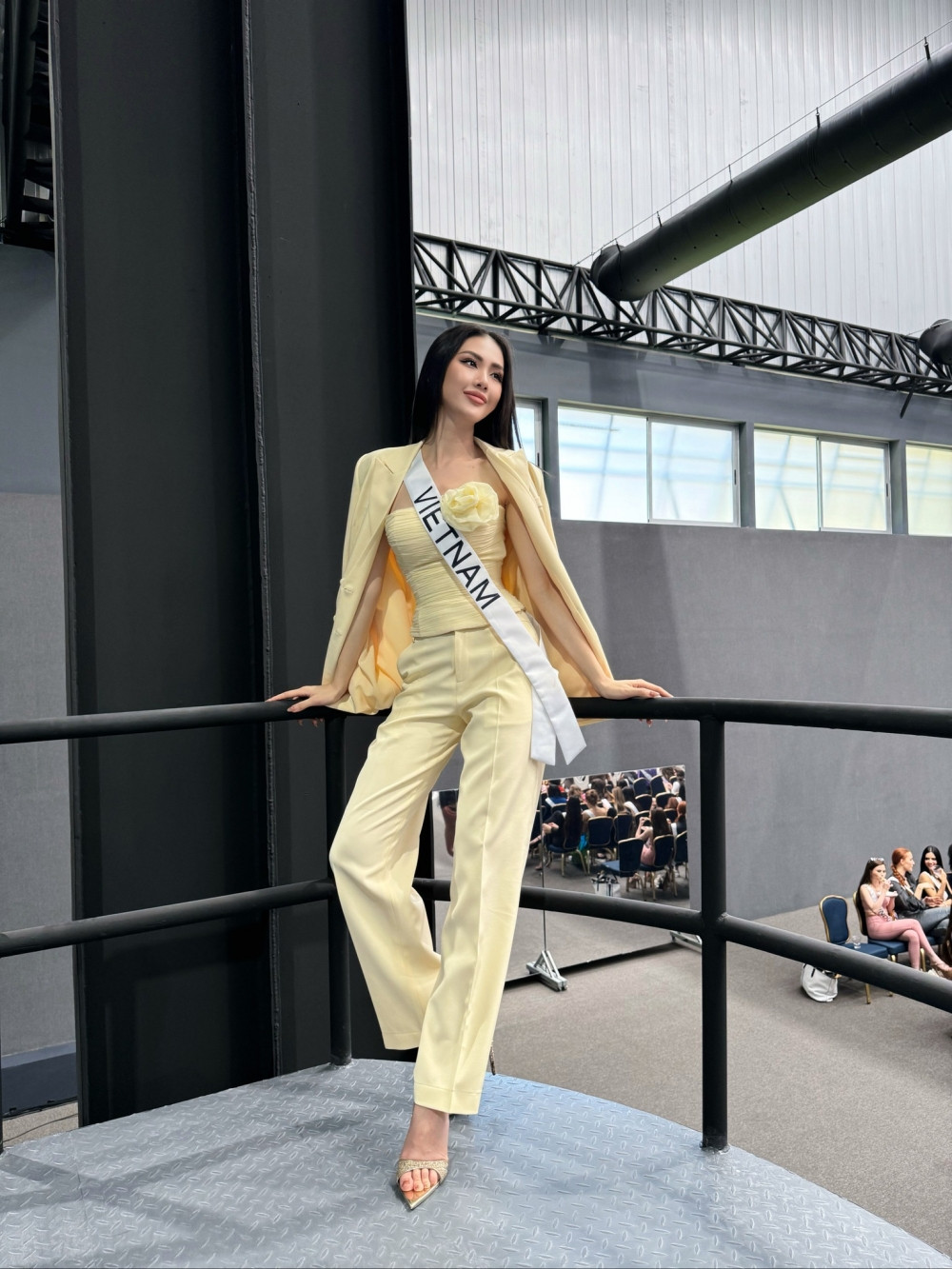 Tiếp đó tại buổi tập luyện đầu tiên với sân khấu mô phỏng cho các đêm thi quan trọng sắp tới, Hoa hậu Bùi Quỳnh Hoa chọn set suit màu vàng nhạt, với điểm nhấn là chiếc áo quây đính hoa, khoe vòng eo siêu nhỏ.