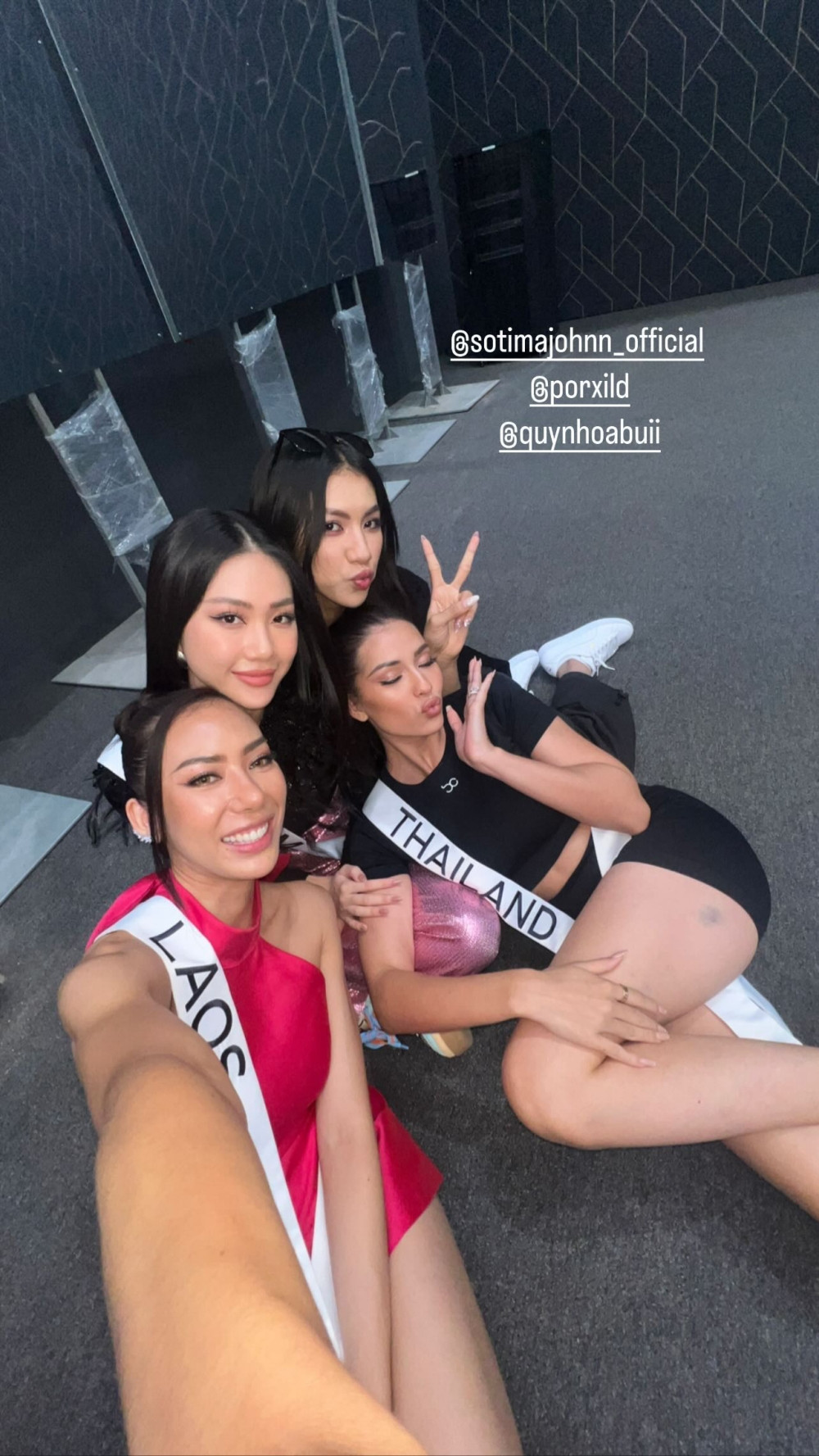 Bùi Quỳnh Hoa thân thiết cùng các đại diện Đông Nam Á trong buổi tập luyện cho đêm Bán kết và chung kết. Trong ảnh gồm các người đẹp: Bùi Quỳnh Hoa, Hoa hậu Lào, Hoa hậu Thái Lan và Hoa hậu Campuchia.