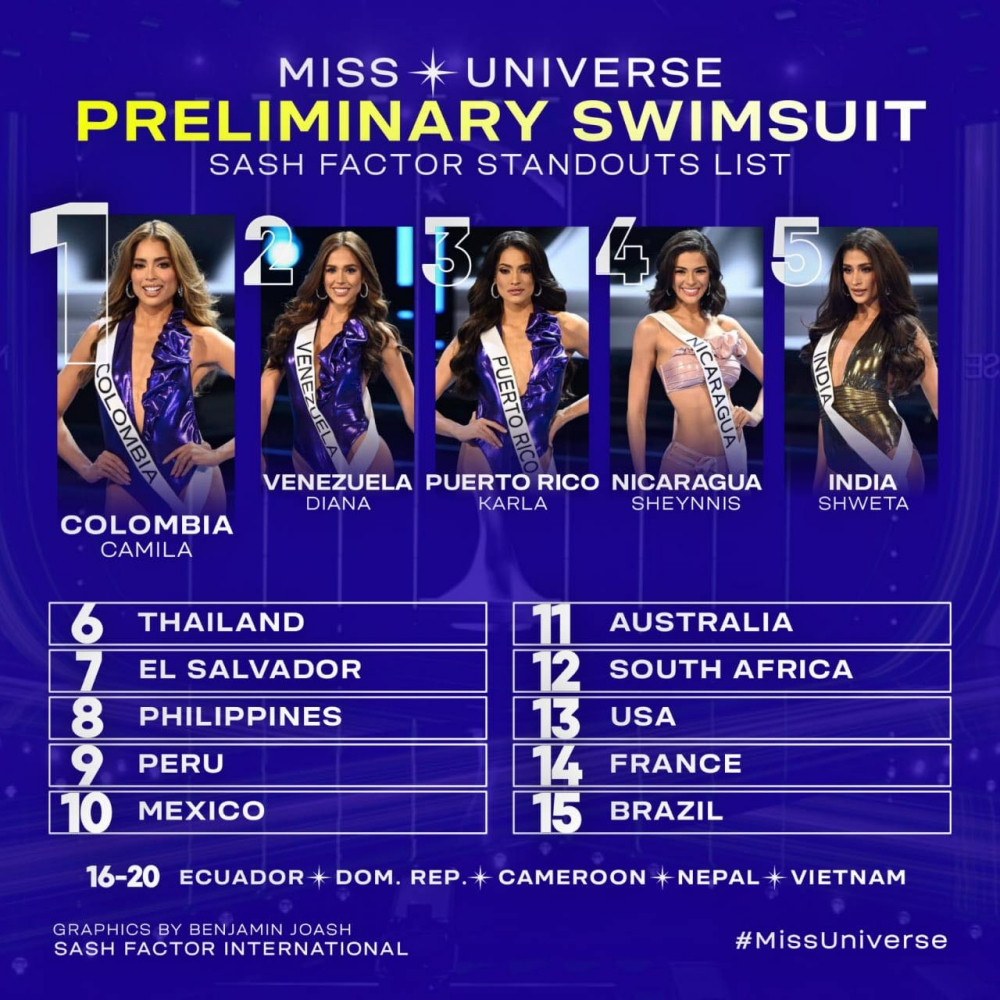 Top 20 thí sinh trình diễn đồ bơi đẹp nhất của Sash Factor tiếp tục ghi nhận sự áp đảo của dàn thí sinh đến từ Mỹ Latinh.