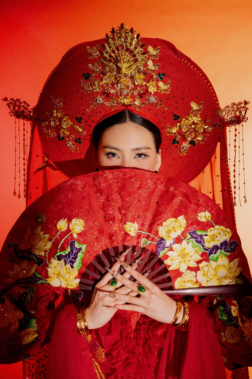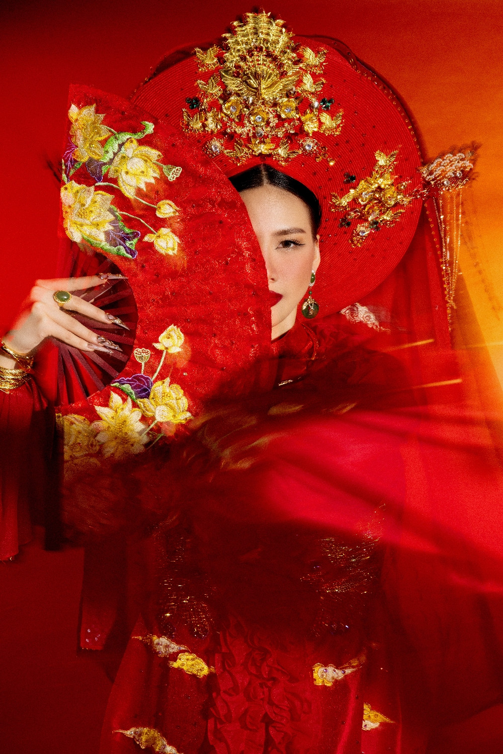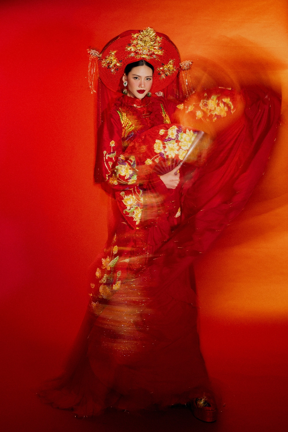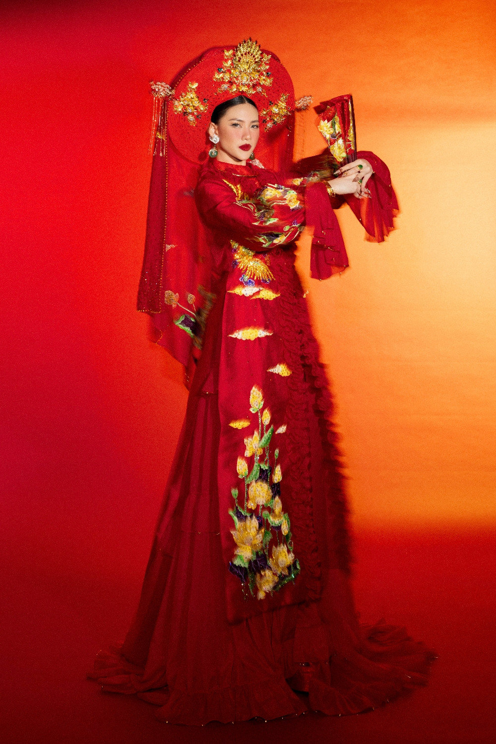 Phom dáng bộ trang phục được lấy cảm hứng từ áo tứ thân. Điểm nhấn là các họa tiết thêu hình đôi chim phụng, hoa sen. Thiết kế còn kết hợp với mấn, quạt và đôi hài.
