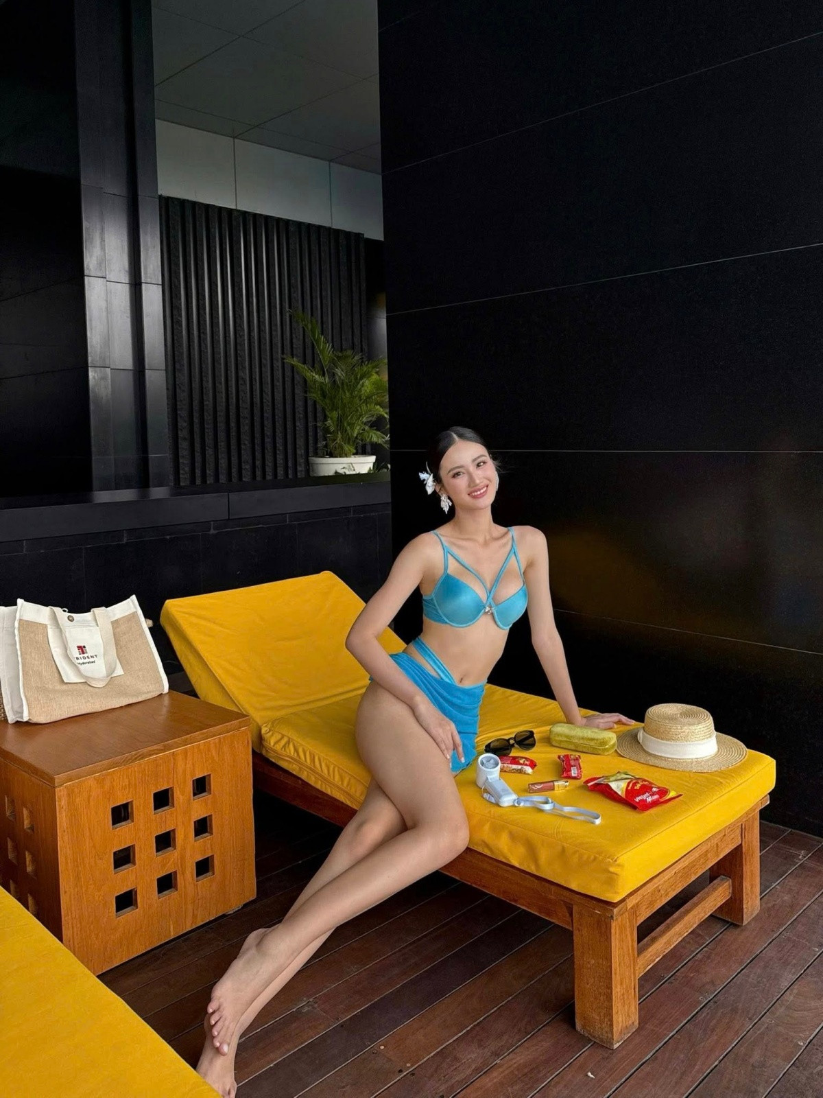Hoa hậu Ý Nhi chọn bộ bikini mang màu xanh dương đặc trưng của Miss World với những đường cut-out đẹp mắt, khoe trọn hình thể. Nàng hậu sở hữu chiều cao 1m75, và số đo vòng eo chỉ 59 cm.