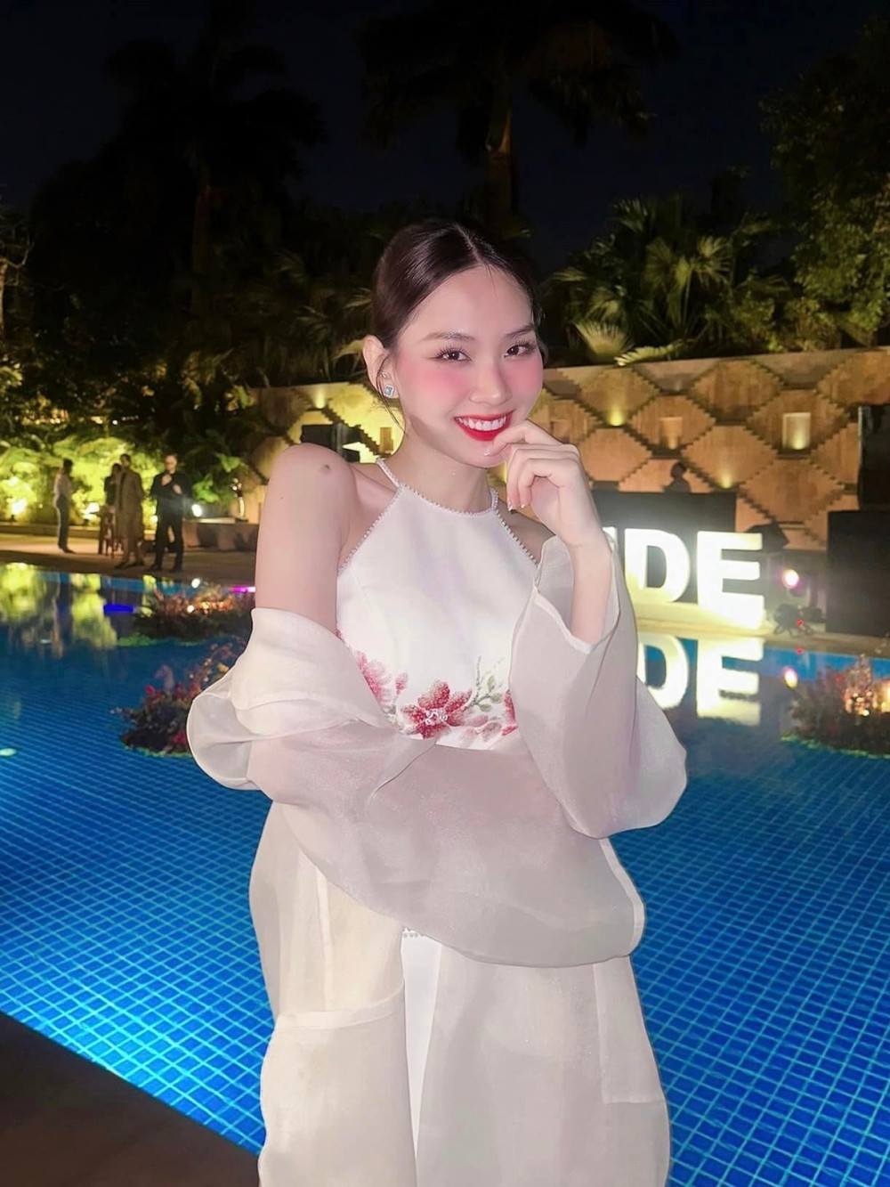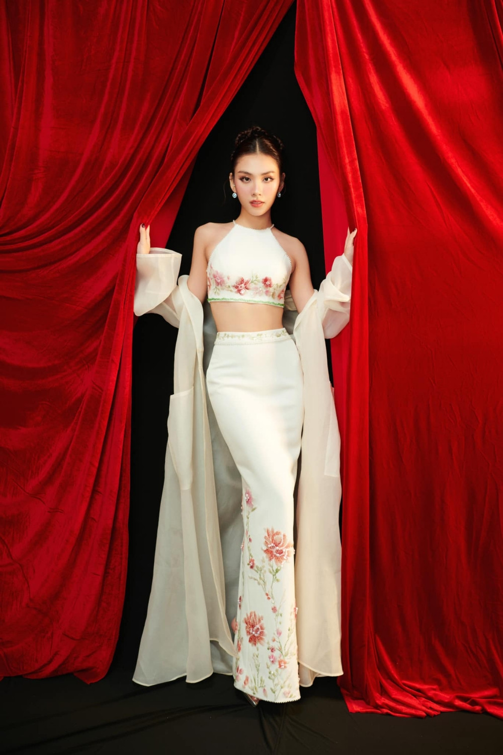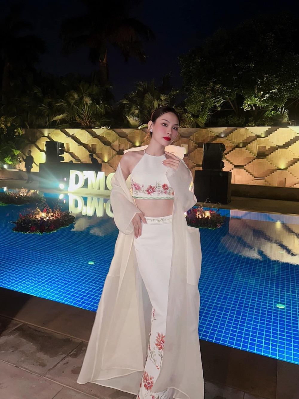 Mẫu váy là thiết kế của NTK Hoàng Tony, chiếc váy mang sắc trắng với phần thân trên form áo cổ yếm dạng crop-top, phần chân váy dài ôm sát. Thiết kế này được thêu hoa màu sắc tinh tế, đẹp mắt.