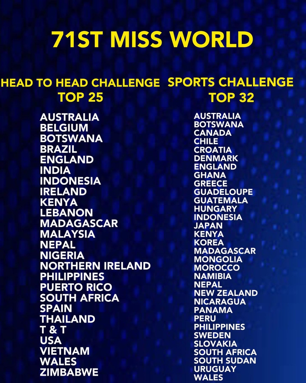 Hai đại diện đến từ Đông Nam Á là Hoa hậu Indonesia và Hoa hậu Philippines đều xuất sắc lọt Top tất cả các phần thi phụ của Miss World lần thứ 71 tính đến thời điểm hiện tại bao gồm: Top 25 Head To Head Challenge, Top 32 Thể thao, Top 23 Tài năng.
