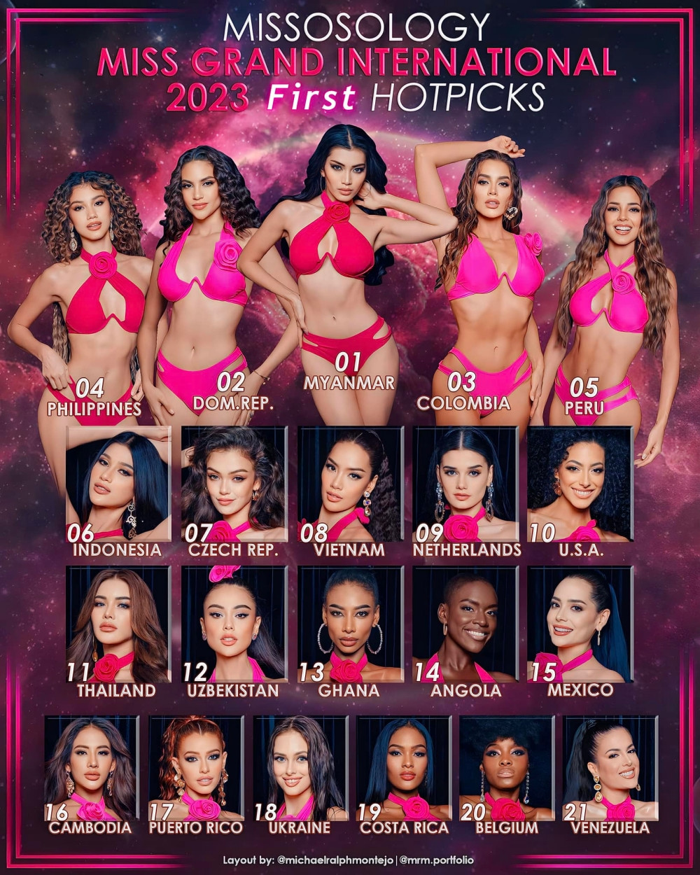 Ở BXH dự đoán đầu tiên, Missosology dự đoán đại diện Myanmar sẽ giành vương miện. Một nguồn tin không chính thống cho rằng Myanmar sẽ là quốc gia đăng cai tổ chức Miss Grand International 2024 nên đại diện của nước này chắc chắn sẽ lọt Top 20 chung cuộc. Hoa hậu Myanmar cũng là một trong số ít các thí sinh luôn áp đảo trong các phần thi bình chọn. Ở BXH dự đoán của Missosology, Hoa hậu Lê Hoàng Phương được dự đoán lọt Top 10 ở vị trí thứ 8.