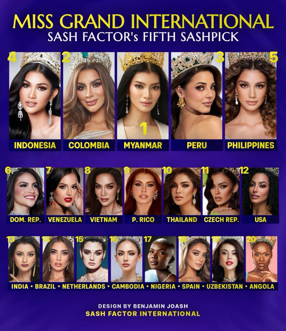 Chuyên trang Sash Factor mới đây cũng đã tung BXH dự đoán lần thứ 5 cho cuộc thi này và cũng dự đoán đại diện Myanmar sẽ giành vương miện. Hoa hậu Lê Hoàng Phương cũng được dự đoán ở vị trí thứ 8.