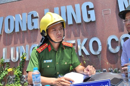 “Trong buổi sáng có 7 công nhân đang làm việc cắt gọt kim loại tại khu vực nhà xưởng ở tầng trệt của công ty. Khi công nhân sử dụng máy để cắt kim loại, tia lửa bắn xuống sàn nhà. Trên sàn có vật liệu dễ cháy nên bắt lửa dẫn hỏa hoạn. Các công nhân này được công ty Kwong Lung – Meko thuê bên ngoài vào làm việc”, đại úy Luyến cho hay nguyên nhân của vụ cháy. Trong ảnh: Nhóm thợ hàn được đưa về trụ sở công an để làm rõ nguyên nhân vụ cháy.