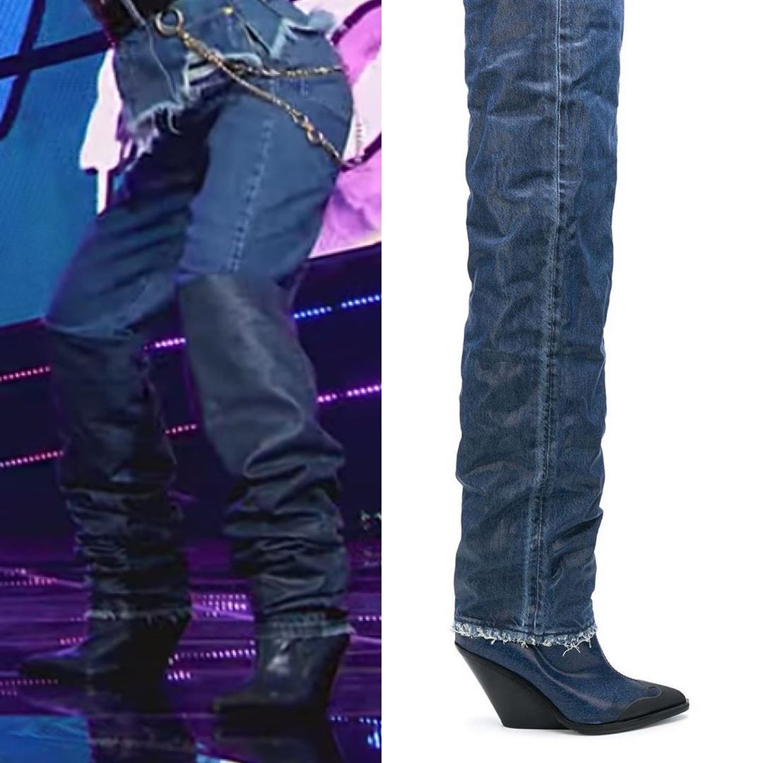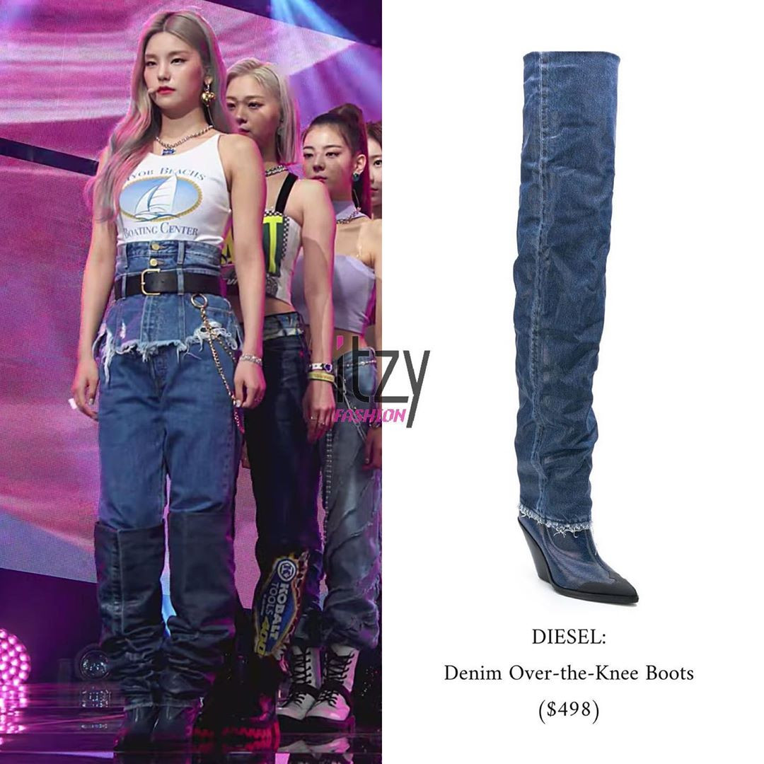 ... và chân đi một đôi bốt giả quần jeans cao đến đầu gối. Tức là 3 lớp đồ jeans chồng nhau, vô cùng rối rắm! Bộ trang phục khiến cho phần eo của Yeji gần như không thấy đâu, đôi chân vốn thon dài thẳng tắp của cô bị giấu toàn bộ trong 3 lớp đồ jeans cũng trở nên ngắn một mẩu, nhìn có phần lôi thôi.