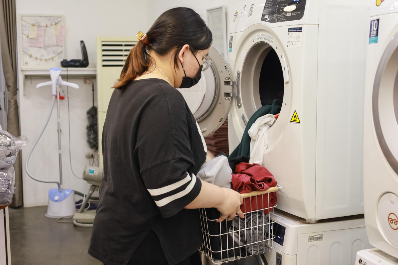| Theo quy trình, quần áo sẽ được giặt, sau đó cho vào máy sấy và được gấp gọn gàng trước khi trở lại tay khách. |