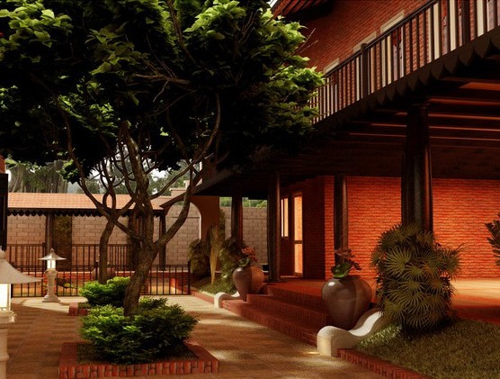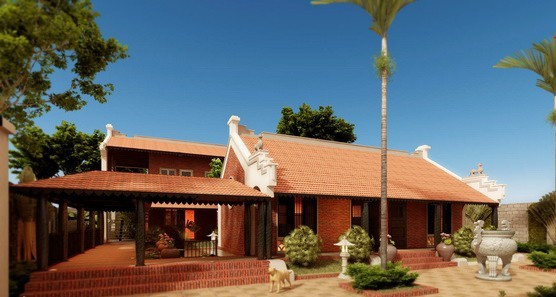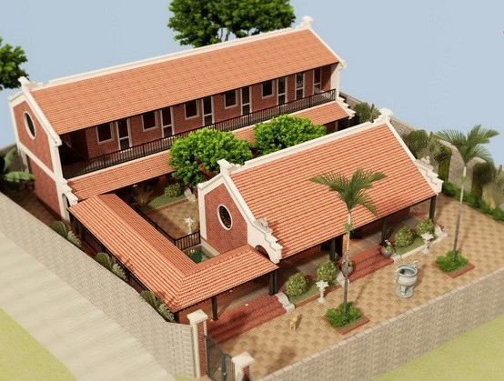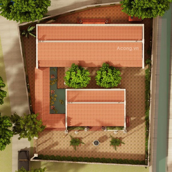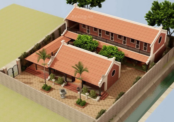 Toàn cảnh công trình nhìn từ trên cao. Phía trước là khối nhà 1 tầng dùng cho việc thờ cúng của dòng họ. Phía sau là khu nhà để ở. Có thể thấy thiết kế này sử dụng triệt để diện tích khu đất, kết hợp trồng cây xanh.