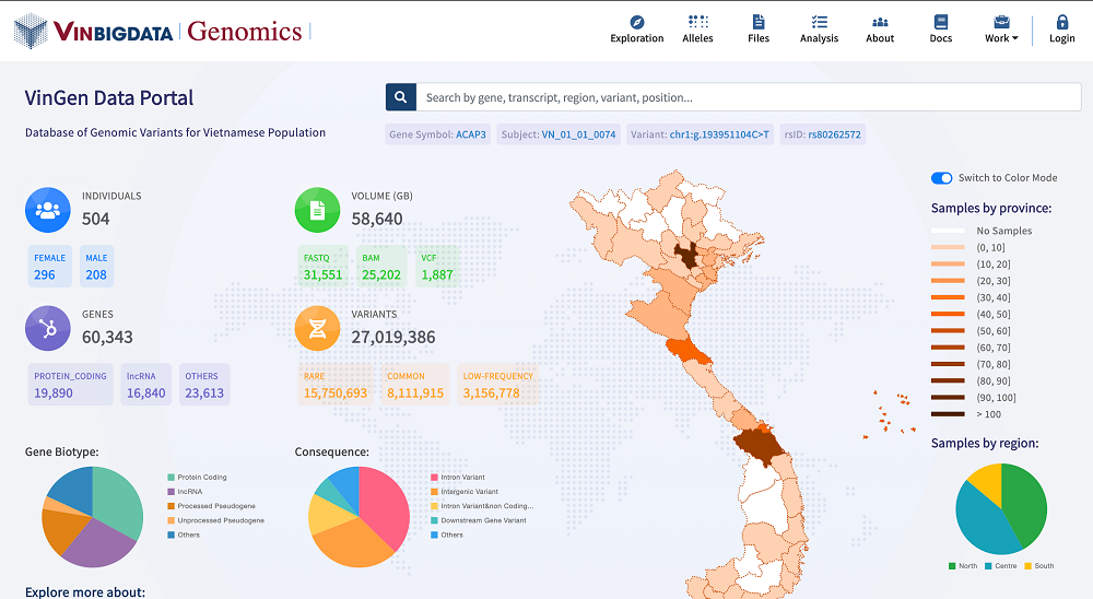 Với hệ thống này, VinBigdata và các đối tác có thể dễ dàng truy cập, tìm kiếm thông tin, phân tích và chia sẻ dữ liệu, đẩy nhanh tiến độ nghiên cứu. Người dùng có thể tra cứu (theo gen, theo biến thể gen, theo từng cá thể, theo mã tra cứu rsID...); tham chiếu, phân tích dữ liệu hệ gen người Việt phục vụ nghiên cứu, phát triển các ứng dụng lâm sàng; chỉ mất dưới 30 phút cho một mẫu phân tích toàn hệ gen. Dự kiến đến cuối năm 2021, hệ thống sẽ cập nhật thêm các bộ dữ liệu từ các dự án nghiên cứu ứng dụng về nguy cơ bệnh và tác dụng phụ của thuốc.