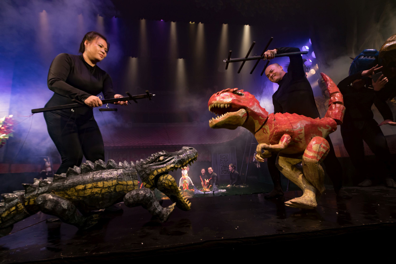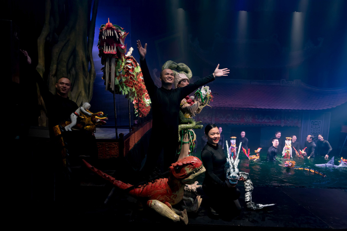 NSƯT Lê Thu Huyền gắn bó với nhà hát 20 năm nay nói đây là vở diễn đầu tiên mang lại cảm xúc đặc biệt. “Chúng tôi phải lồng ghép ngôn ngữ hình thể với biểu diễn rối trong nền âm nhạc hiện đại nêu bật thông điệp Việt nam là đất nước của hòa bình”, chị nói. Nghệ sĩ phải mang trang phục tạo hình rồng đất nặng hơn 10kg, vừa diễn trên cạn vừa diễn dưới nước mà không có bảo hộ.
