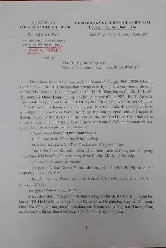 Chiều 31/1, Đại tá Dương Văn Mạnh, Phó giám đốc Công an tỉnh Bình Phước đã ký công văn hỏa tốc gửi trưởng các phòng, trại, trưởng công an huyện, thị xã, thành phố trên địa bàn tỉnh về việc phối hợp truy bắt đối tượng Lê Quốc Tuấn (tức Tuấn “khỉ”) - nghi can nổ súng làm 4 người tử vong và 1 người bị thương trên địa bàn TP. Hồ Chí Minh.