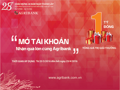 Chương trình “Mở tài khoản - Nhận quà lớn cùng Agribank” năm 2016, vừa là thông điệp của Agribank muốn gửi gắm đến tất cả quý khách hàng nhân ngày hội lớn của Agribank (kỷ niệm 28 năm ngày thành lập), vừa là mong muốn được mang đến cho khách hàng những trải nghiệm về dịch vụ, tiện ích với những giải thưởng thật hấp dẫn.