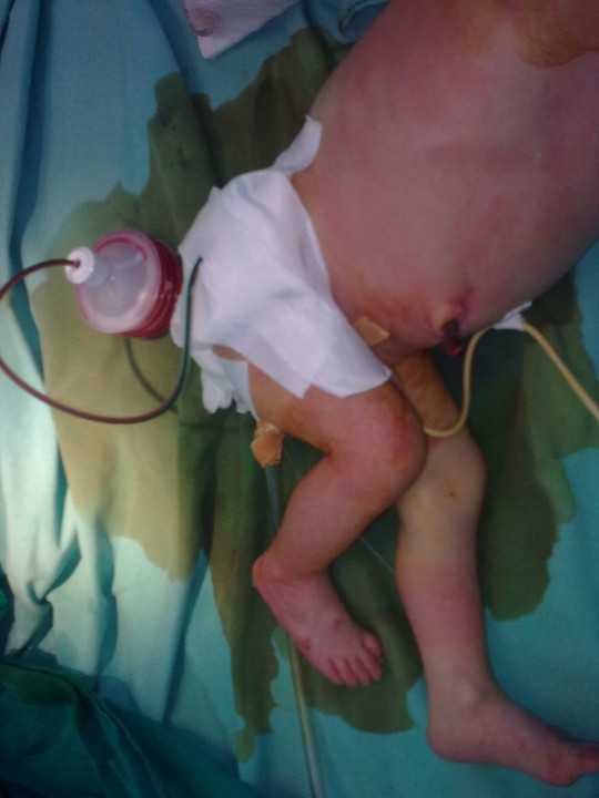 Lúc nhập viện, bé suy hô hấp nhẹ, vàng da, chóp u bắt đầu có hiện tượng loét. Bé nhanh chóng được điều trị nâng đỡ chống nhiễm trùng, chiếu đèn điều trị vàng da và lên lịch mổ cắt u.