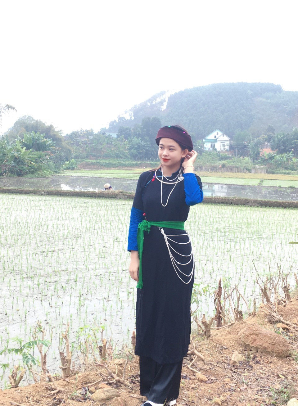 | Thùy Trang xinh đẹp trong bộ trang phục truyền thống dân tộc Tày. |