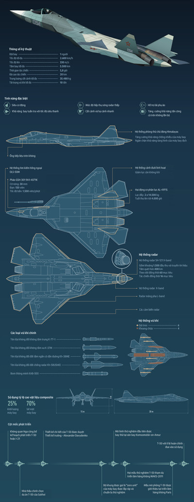 Máy bay chiến đấu thế hệ thứ năm của không quân Nga mang tên T-50, hay còn gọi là Sukhoi PAK FA, đang thử nghiệm để sản xuất hàng loạt được trang bị công nghệ tàng hình tối tân và kho vũ khí đầy uy lực.