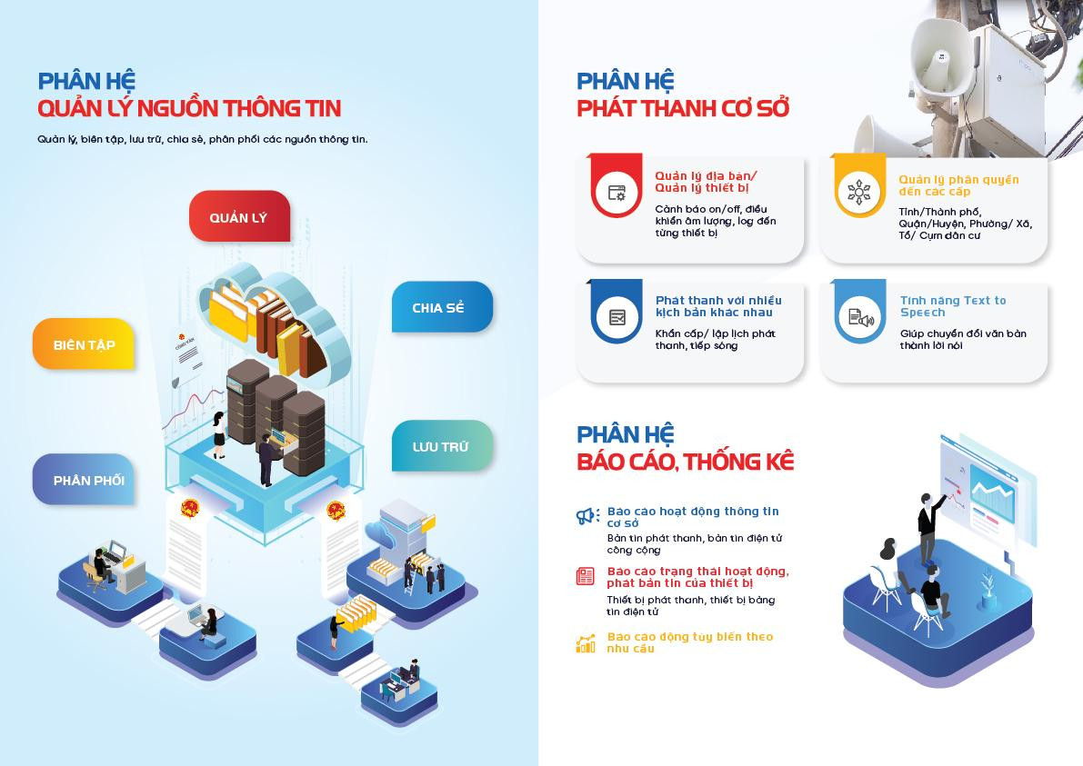 Hiện tại, giải pháp quản lý thông tin Nguồn thông minh đang có sáu phân hệ: Quản lý đài truyền thanh ứng dụng CNTT-VT; Quản lý thiết bị; Biên tập bản tin phát trên đài truyền thanh ứng dụng CNTT-VT; bản tin đăng tải trên bảng tin điện tử công cộng; Quản lý bản tin phát trên đài truyền thanh ứng dụng CNTT-VT; bản tin đăng tải trên bảng tin điện tử công cộng; Báo cáo, thống kê và Tiếp nhận, xử lý ý kiến phản ánh, kiến nghị của người dân.