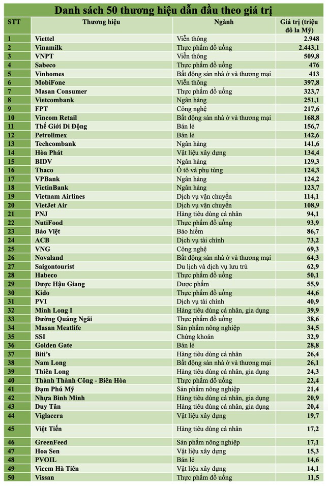10 thương hiệu đứng đầu xét theo giá trị chiếm hơn 60% tổng giá trị của danh sách. Nếu xét theo lĩnh vực, cùng với thực phẩm đồ uống, viễn thông thuộc nhóm ngành sở hữu nhiều doanh nghiệp nhất trong top 10 gồm Viettel, VNPT và MobiFone và đạt tổng giá trị thương hiệu là 3,85 tỷ USD, chiếm 47,3% trong top 10 thương hiệu có giá trị lớn nhất.