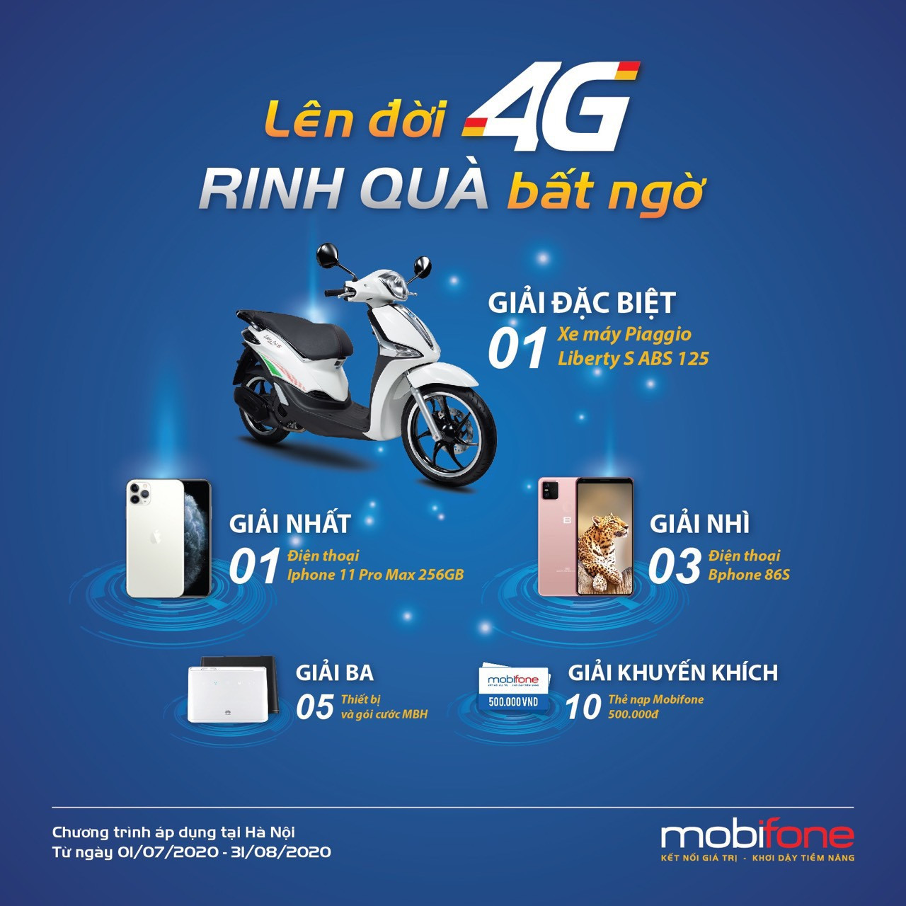 Đặc biệt hơn, khi đổi sim 3G lên 4G các khách hàng trên địa bàn Hà Nội còn có thể tham gia chương trình quay số trúng thưởng “Lên đời 4G, rinh quà bất ngờ” với cơ cấu giải thưởng hấp dẫn bao gồm: 01 Xe máy Piaggio Liberty S ABS 125, 01 Điện thoại iPhone 11 pro max 256GB, 03 điện thoại Bphone 86s, 05 thiết bị kèm gói cước MobiHome và 10 thẻ nạp điện thoại Mobifone trị giá 500.000đ, tổng giá trị giải thưởng lên tới hơn 155 triệu đồng.