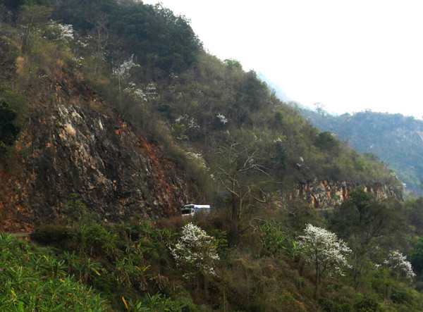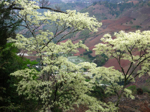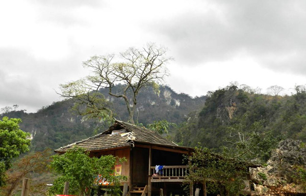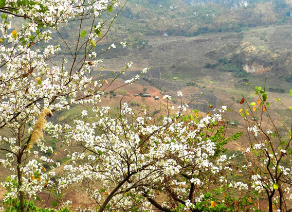 Nhìn xuyên qua gốc hoa ban, bên kia đồi là những ngôi nhà sàn nhỏ xinh