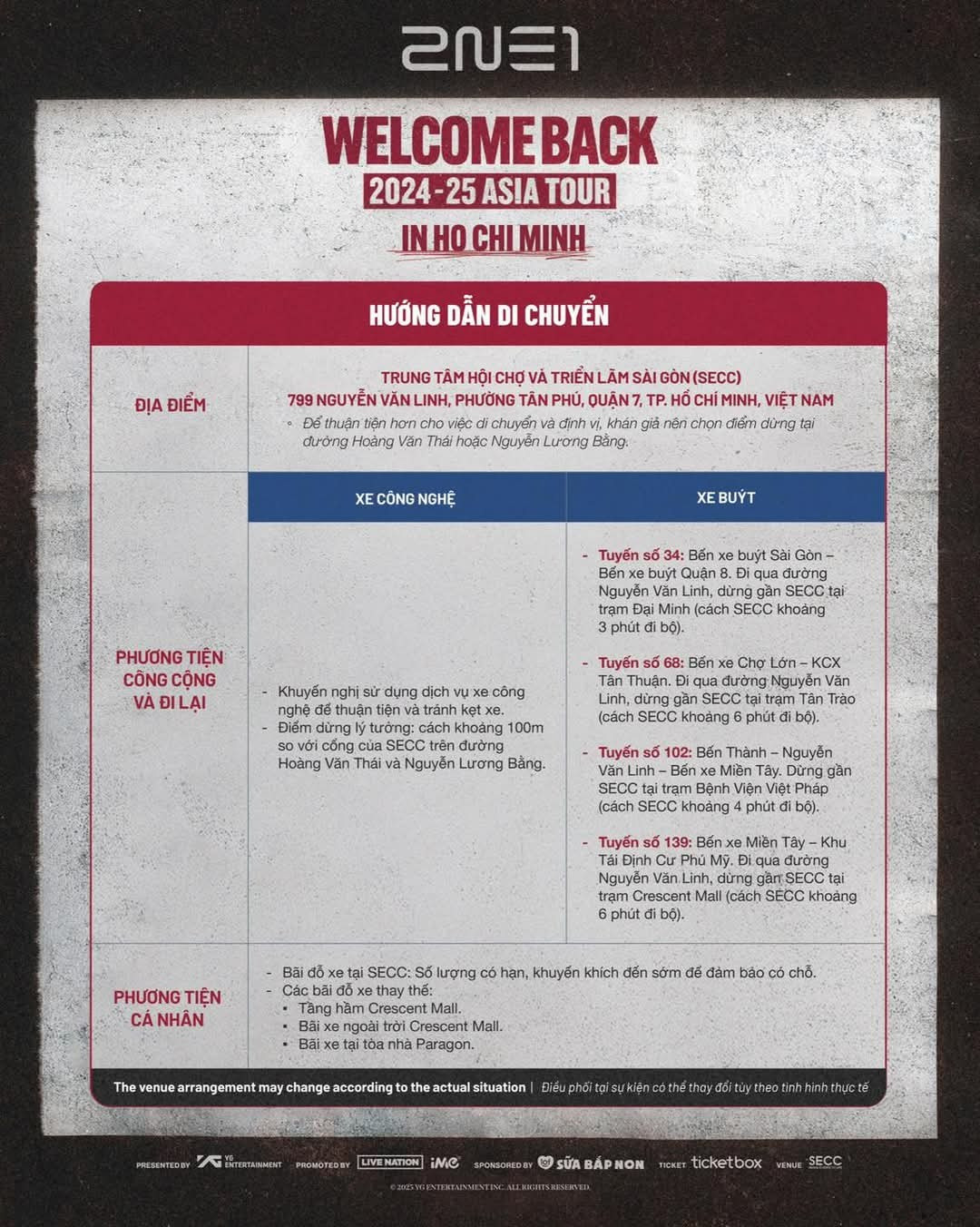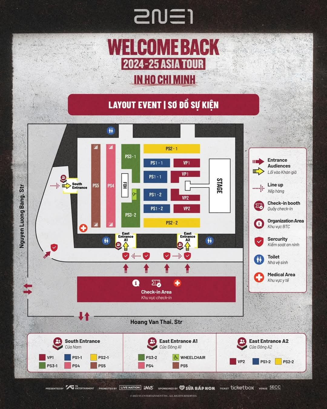 Concert 2NE1 sẽ diễn ra tại Trung tâm hội chợ và triển lãm Sài Gòn - SECC (số 799 đường Nguyễn Văn Linh, phường Tân Phú, Quận 7, TP.HCM). Sơ đồ chi tiết cho khán giả nắm được các cổng vào tương ứng với từng hạng vé, khu vực kiểm soát an ninh, y tế...