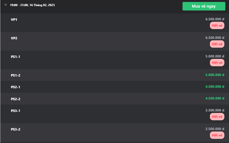 Toàn bộ vé concert của 2NE1 trong đêm đầu tiên đã sạch bách sau 3 ngày mở bán. Hiện tại, ngày 2 chỉ còn 2 hạng vé (nằm ở 3 khu vực) là PS2 (4,5 triệu đồng) và PS1-2 (5 triệu đồng).