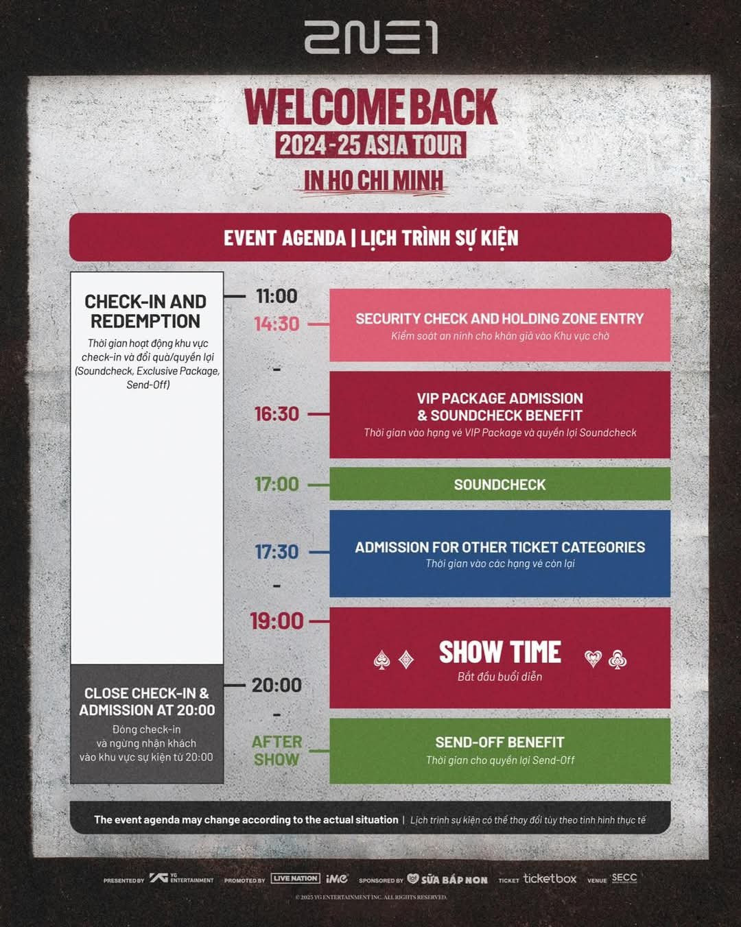 Theo mốc thời gian ban tổ chức công bố, ở hai ngày concert, thời gian mở cổng check-in là 11h. Fan có thể tới sớm để đổi vé, đổi quà/ quyền lợi... Toàn bộ vé đêm diễn đều là vé ngồi, đã đánh số ghế theo mỗi mã vé. Vì thế, người hâm mộ không cần phải tới quá sớm để xí chỗ. Ban tổ chức cũng thông báo nghiêm cấm hành vi cắm trại qua đêm hoặc trước thời gian check-in tại địa điểm diễn ra concert.