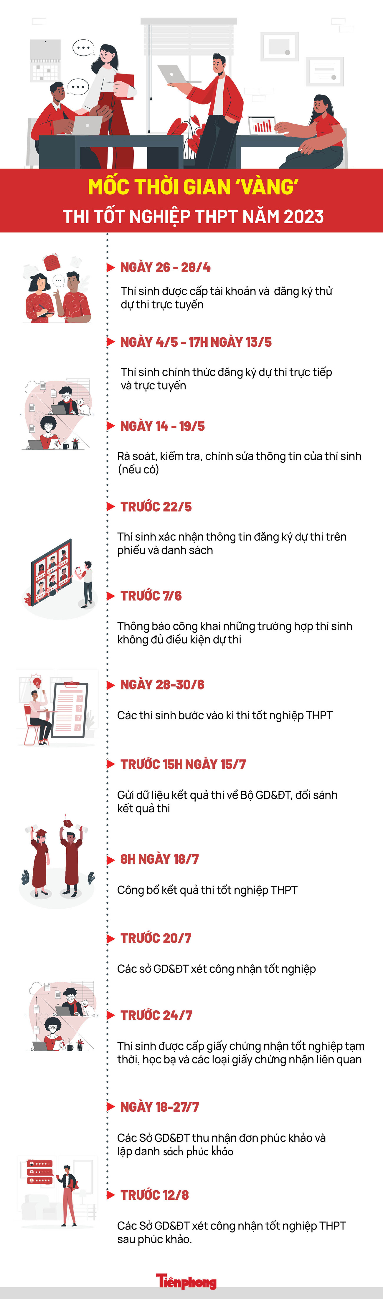 TPO - Bộ GD&ĐT đã công bố chi tiết lịch thi tốt nghiệp THPT năm 2023. Dưới đây là những mốc thời gian quan trọng trong kỳ thi mà thí sinh cần ghi nhớ.