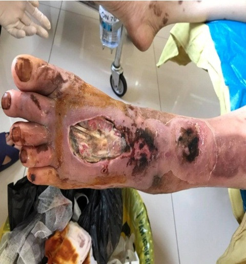 Tại khoa Điều trị tích cực Bệnh viện Nội tiết Trung ương, bệnh nhân được cấp cứu trong trong tình trạng xuất hiện các dấu hiệu nhiễm trùng huyết, cơ thể mệt mỏi, da niêm mạc nhợt nhạt, sốt cao trên 38 độ C. Bệnh nhân có vết loét tại vị trí mu bàn chân trái, sưng nóng đỏ, kích thước lớn, sâu, vết thương hoại tử lan rộng gần hết mu chân, lan tỏa xuống gan chân, chảy dịch hôi thối...