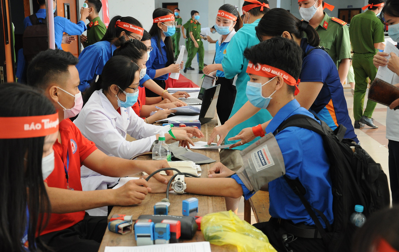 Gần cuối giờ buổi sáng nhưng vẫn còn đông đảo các bạn trẻ, cán bộ, chiến sĩ công an đến đăng ký hiến máu.
