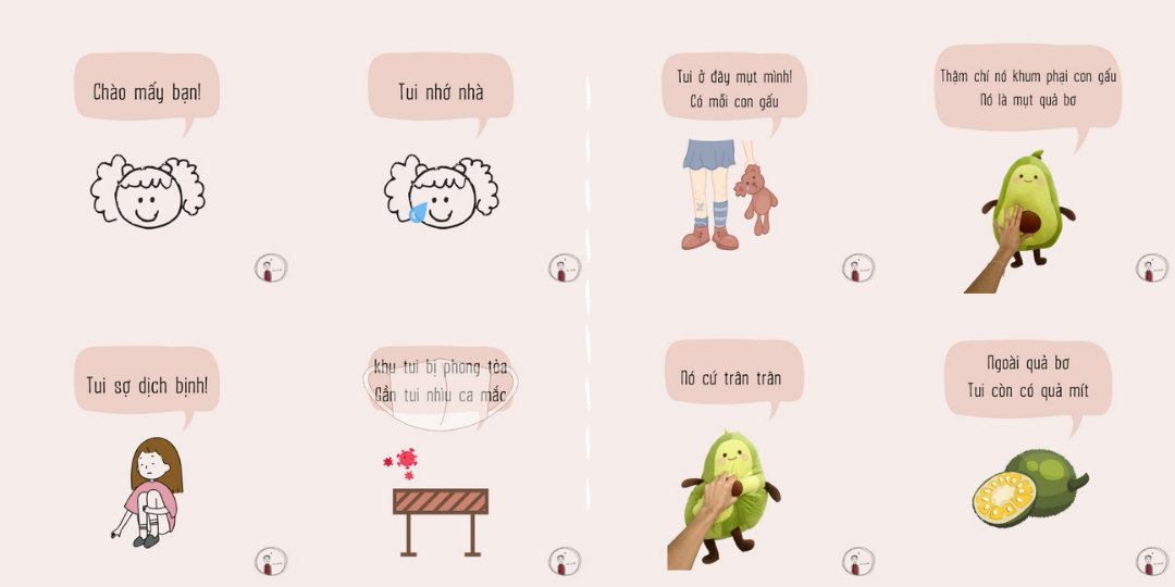 Mỗi câu chuyện là sự liên kết của nhiều bức tranh khác nhau, nếu tách từng hình ra sẽ không có ý nghĩa. Một bộ truyện nhỏ chỉ tập hợp từ 12 - 18 tấm hình riêng lẻ. Về ý tưởng của những “câu chuyện ảnh”, cô tâm sự: “Mình thường làm mấy bộ ảnh đó trong khoảng thời gian mình bị stress. Vì mình đang sống trong khu phong tỏa, mà mình lại không thể về nhà, nên lúc nào trong lòng cũng sợ, cũng buồn. Những lúc đó thì mình sẽ viết, nhưng mình không muốn những người đọc bài của mình phải buồn theo. Vậy nên mình vẽ. Có lúc mình vừa vẽ, vừa khóc nữa. Thế mà, lúc xem tranh của mình, mọi người vui lắm. Cũng từ đó mà mình mới nhận ra, mình có khả năng biến những câu chuyện “buồn” thành những câu chuyện “buồn cười””.