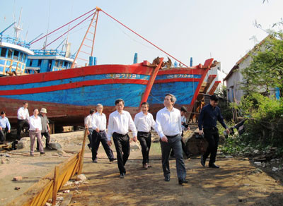 Trong chiều 7/3, Thống đốc Bình cũng đi thăm HTX đóng tàu Nghĩa Phú (xã Nghĩa Phú, Thành phố Quảng Ngãi, tỉnh Quảng Ngãi).