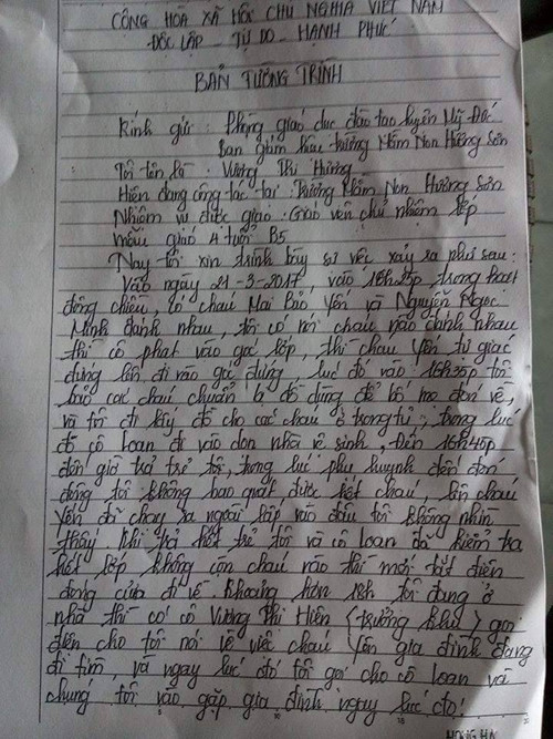 Trước nội dung tường trình của giáo viên như vậy, gia đình bé Yến tỏ ra khá bức xúc.