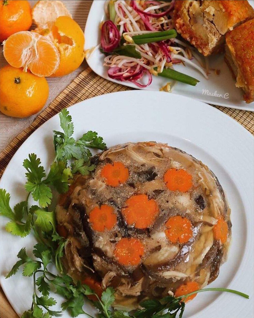 Tết Nguyên Đán diễn ra vào thời điểm miền Bắc còn giá rét. Vì vậy, thịt đông thường được lựa chọn làm món ăn chính trong những ngày này. Nguyên liệu làm thịt đông thường là phần chân giò heo, bên cạnh đó là cà rốt, mộc nhĩ, bì heo, hạt tiêu... Thịt chân giò cùng các nguyên liệu kèm theo được ninh nhừ, sau đó để đông đặc lại giống món thạch vừa đẹp, ăn lại ngon miệng, phù hợp ngày Tết.