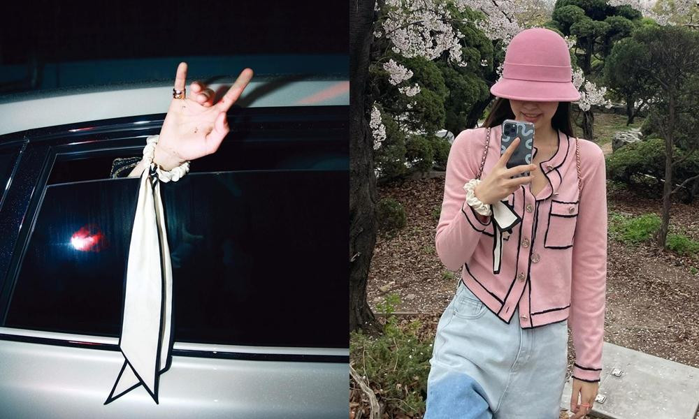 Jennie đeo chiếc dây buộc tóc kiểu schrunchie màu trắng với dải vải dài ở tay, sau đó lại dùng để buộc tóc trong loạt ảnh ngắm hoa anh đào cô đăng trên tài khoản IG của mình gần đây.