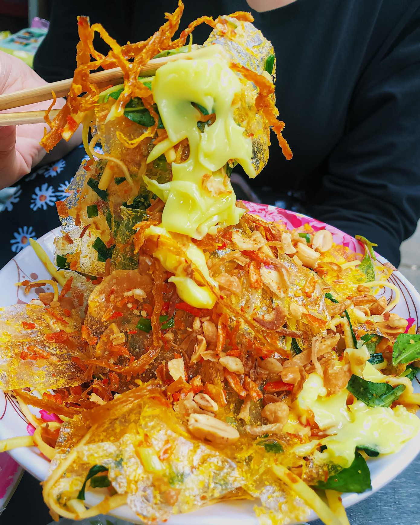 Ảnh: Sam NguyễnMón ăn ngon trứ danh của teen Sài Thành kiêm “đặc sản” đường phố chưa bao giờ vắng mặt trong bản đồ ăn vặt. Có teen chỉ thèm bánh tráng “chay” chấm mắm me hoặc muối tắc. Cũng có teen chỉ mê bánh tráng trộn mix đủ thứ topping hấp dẫn như khô bò, trứng cút, chấy tôm… Và nếu bạn không ngại béo thì bánh tráng trứng cút chấm bơ sẽ là “chân ái”.
