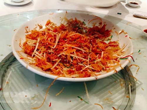 Món này đặc biệt chỉ đến ngày rằm tháng 1 âm lịch là không còn tìm thấy nữa. Món Phát tài thực tế là loại gỏi ăn cùng cá hồi sống, các loại rau củ thái sợi như đu đủ, khoai môn, bưởi, gừng chua...