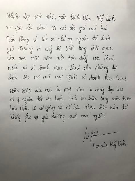 Nhân dịp năm mới, Hoa hậu Mỹ Linh đã viết thư tay để gửi đến bạn đọc của Báo Tiền Phong và những người đã luôn ủng hộ, yêu mến cô trong suốt thời gian qua.