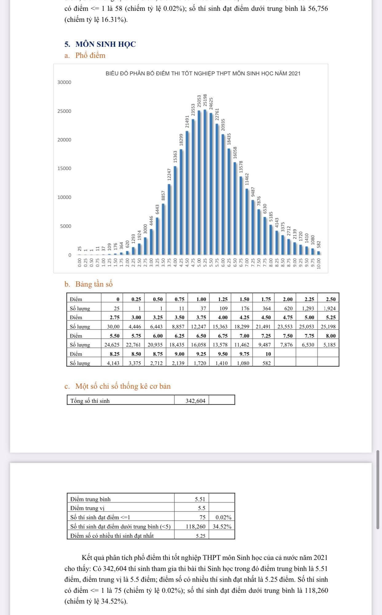 Cụ thể, năm 2019, điểm trung bình của môn Sinh là 4,68 điểm; Điểm số có nhiều thí sinh đạt nhất là 4,5. Năm 2020, điểm trung bình là 5,59 điểm; điểm trung vị là 5,5.