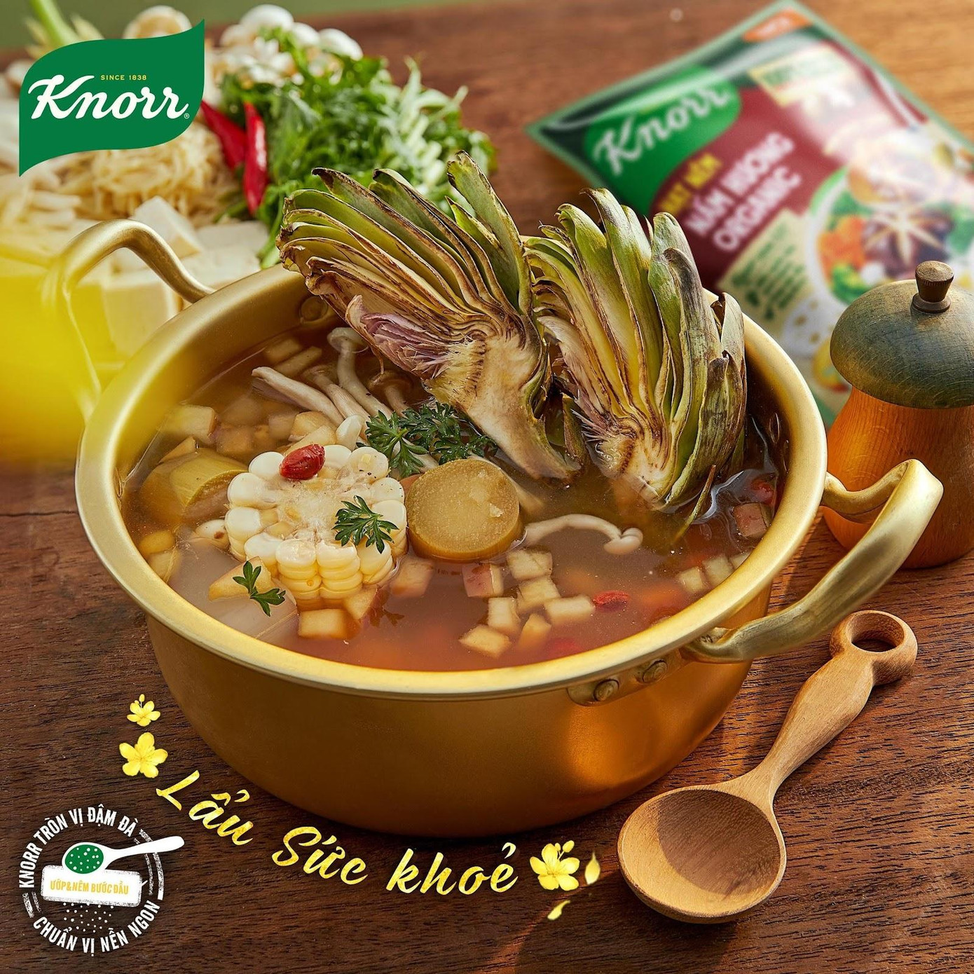 Nhắc đến ẩm thực miền Trung sao có thể thiếu món ăn làm từ bông atiso. Bông atiso giàu vitamin, chất chống oxy hoá, hỗ trợ khỏe gan và điều hoà huyết áp kết hợp cùng các loại rau củ ngọt nhẹ hầm cùng hạt nêm Knorr nấm hương organic làm nên món “Lẩu sức khoẻ” ngọt lành mà đậm đà, ít dầu mỡ, cân bằng mâm Tết.