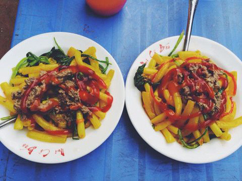 Nui xào bò: Theo đánh giá của nhiều người, món này trong ngõ Văn Chương được xào vừa tay. Do vậy, nui mềm, không quá dai và thấm đủ các loại gia vị đi kèm. Thịt bò xào cùng được thái mỏng vừa ăn và ngọt tự nhiên. Thông thường, một đĩa đầy đủ sẽ có thêm rau cải chống ngấy và chút sốt cà chua, ớt. Nếu không thích, bạn có thể nhờ chủ quán bỏ riêng. Một đĩa có giá 20.000 đồng. Ảnh: lozi.
