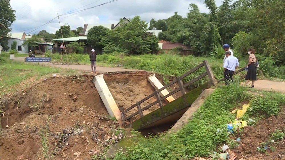 Người dân chạy ra kiểm tra thì phát hiện cây cầu bị đổ sập xuống suối. Toàn bộ phần móng, trụ đều bị đổ gãy, kéo theo đất đá bị sạt lở, đổ dồn xuống suối.