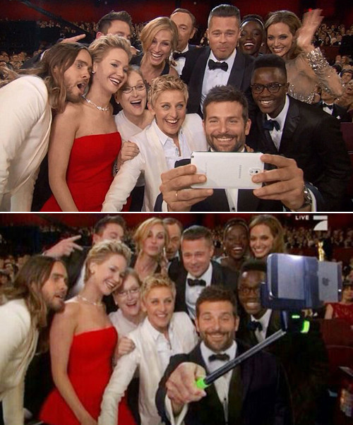 Bức ảnh “tự sướng” của các ngôi sao ở Oscar là một ví dụ điển hình cho nhược điểm của chụp ảnh selfie. Những người quảng cáo selfie stick đã ghép thêm chiếc "gậy tự sướng" vào trong ảnh nhằm khẳng định đây là sản phẩm cực phù hợp để chụp tập thể.