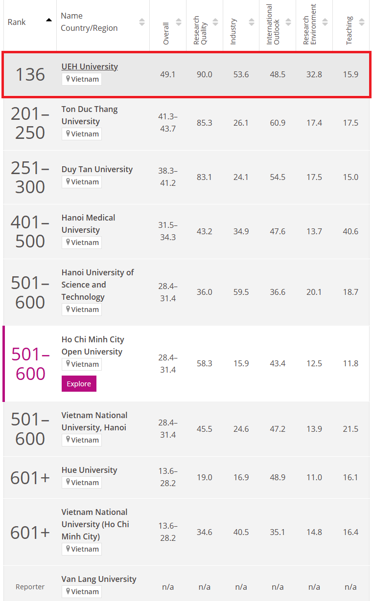 Đại học Kinh tế TP.HCM (UEH) bất ngờ được xếp hạng ở vị trí 136 trong bảng xếp hạng THE 2025. Trước đó, ĐH Kinh tế TP.HCM đã lọt vào Bảng xếp hạng đại học thế giới năm 2025 (THE World University Rankings 2025), với vị trí Top 501-600 đại học hàng đầu thế giới. Đây là kết quả cao nhất trong số các cơ sở giáo dục đại học tại Việt Nam được xếp hạng trong cùng đợt đánh giá.