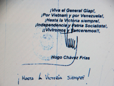 | Những dòng kết trong thư mừng thọ Tướng Giáp 100 tuổi ( ngày 25-8-2011) của TT Hugo Chavez: Tướng Giáp muôn năm!